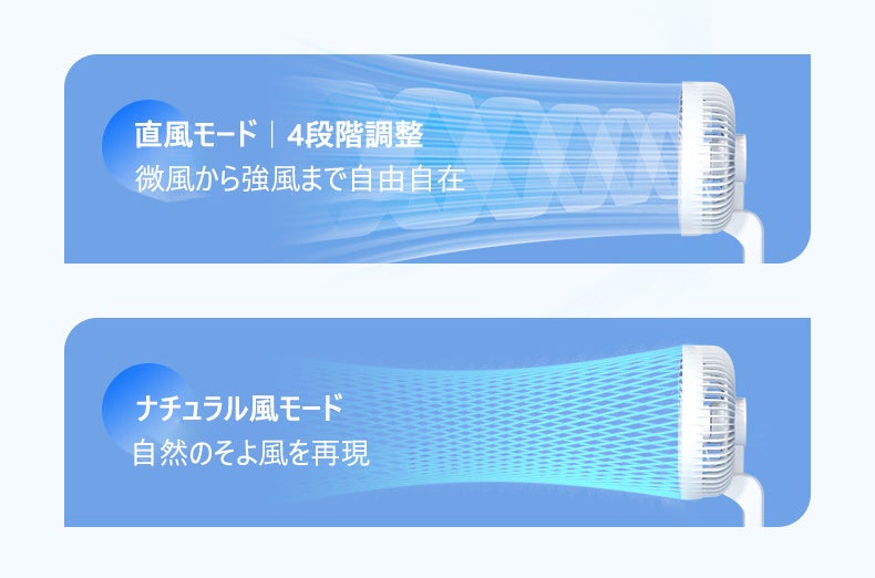 FDLAIは、「直風モード」と「ナチュラル風モード」の2タイプの風を搭載。 直風モードは、最大4段階の風量調整が可能。暑い日はしっかり涼しく、弱風にすればデスクワーク中にもぴったり。