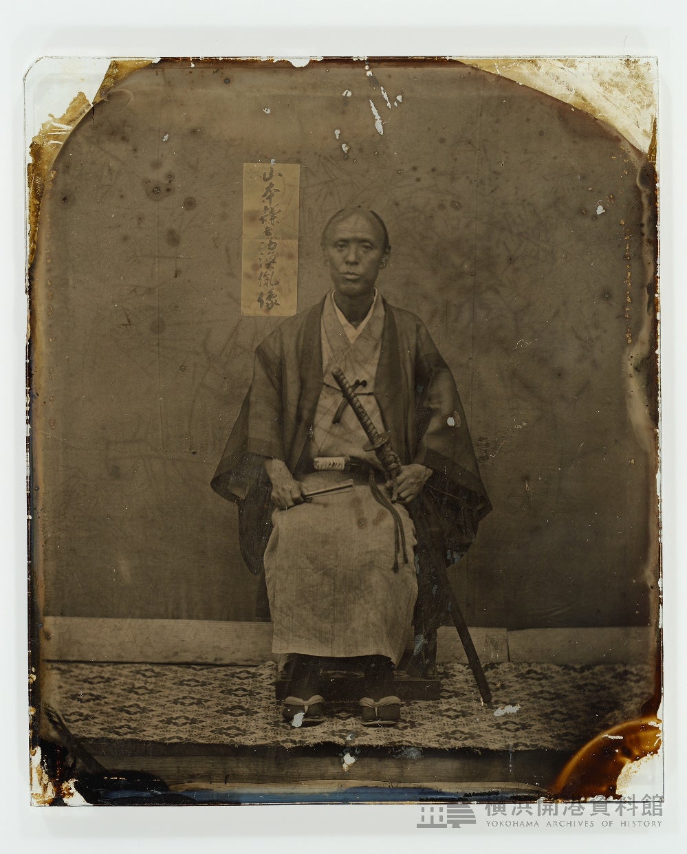 下岡蓮杖は横浜にスタジオを構えた写真家。神奈川奉行所の役人たちも蓮杖に肖像画を撮ってもらっていました。本写真はアンブロタイプ(湿板ガラスネガの背景に黒い紙などを敷き、画像をポジに見せる形態)の肖像写真で、敷物の柄から横浜の下岡蓮杖の写真館で撮影されたものと判明します。蓮杖のガラス板写真はきわめて貴重なものです。写された山本謙兵衛は下田でも勤務しており、その頃から蓮杖とは知り合いだったと考えられています。