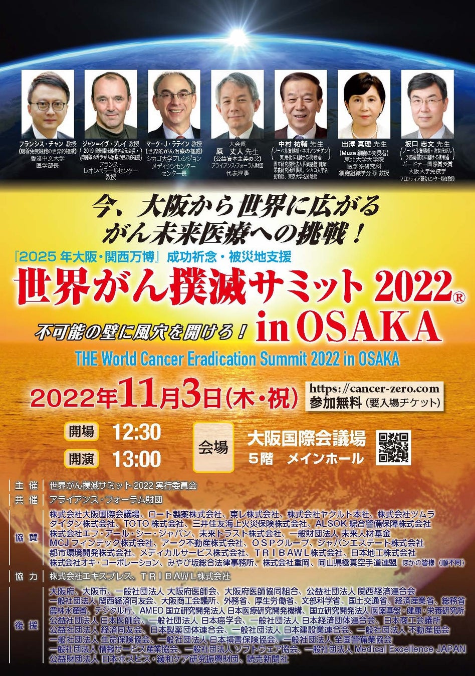 11月3日(木・祝)午後1時より開催された『世界がん撲滅サミット2022 in OSAKA』(https://cancer-zero.com)が関係者、来賓、来場者約1000名を迎えて大成功のうちに閉幕した。