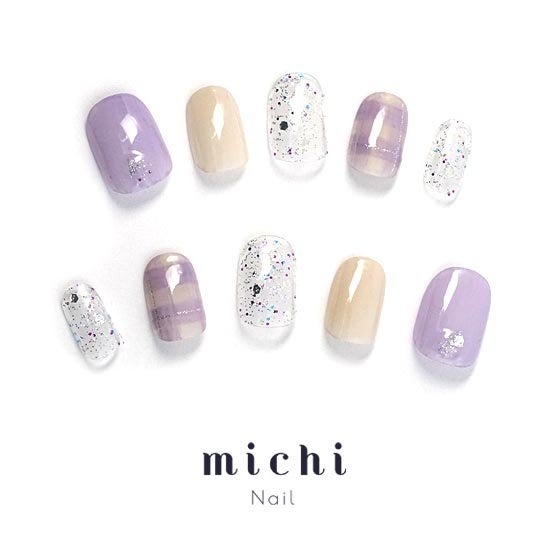 くすみパープルとクリアカラーがさわやかなこちらのネイル。クリアベースにカラフルなラメをちりばめたネイルは、炭酸ドリンクのようなサッパリ感があります。パープルとアイボリーを合わせることで肌なじみもよく、ファッションを選ばず使いやすいデザインになっています。