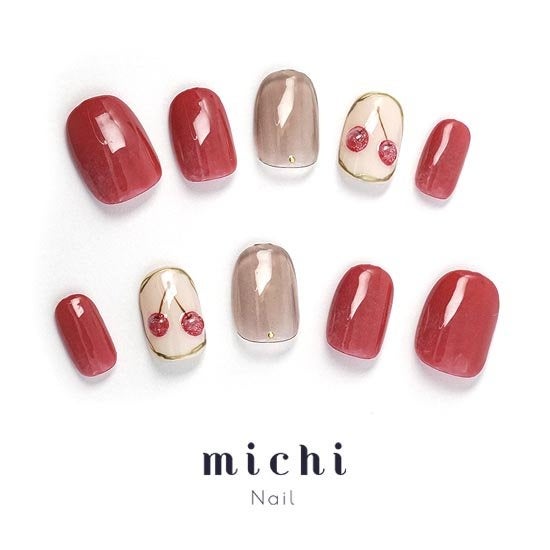 大人っぽいレッドとベージュカラーにさくらんぼがのったこちらのネイル。さくらんぼ部分は立体感があり存在感ばっちりです。ゴールドの縁取りでゴージャスさも感じられ、大人かわいいネイルをお探しの方にお勧めです。