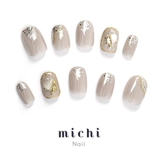 肌なじみもよく大人の女性らしいグレージュカラーとグリッターがゴージャスなこちらのネイル。薬指にはワンポイントでシェルが飾られています。ゴールドとシルバーがほどよく輝き、結婚式のお呼ばれからオフィスまで使える万能デザインになっています。