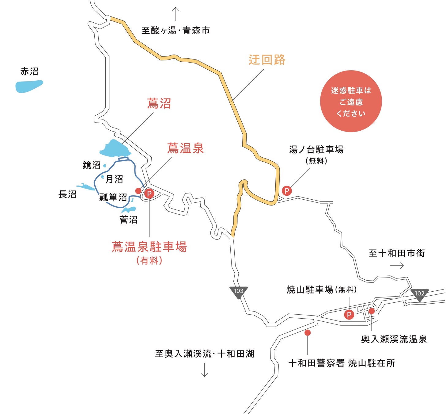 紅葉期では、蔦沼へ向かう国道103号の一部区間は混雑が予想されます。青森市と奥入瀬渓流を結ぶ道路を利用される方は、迂回路(十和田市道「湯ノ台高原線」)のご利用が便利です。