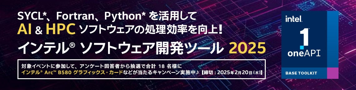 エクセルソフト株式会社 (東京都港区) は、2024年11月に発表されたインテル® ソフトウェア開発ツールの最新バージョン 2025 のリリースを記念して、1/17 (金) AI + HPC DEVELOPER TECH DAY 2025 もしくは、1/23 (木) インテル・ソフトウェア開発ツール 2025 リリースセミナーに参加いただき、事後アンケートにご回答いただいた方の中から、抽選で 3 名様に「ASRock インテル® Arc™ B580 Steel Legend 12GB OC グラフィックスカード」、5 名様に「ロジクール ワイヤレス・ヘッドセット Zone 300」、10 名様に「Amazon ギフトカード 1,000 円分」が当たるプレゼント・キャンペーンを実施します。