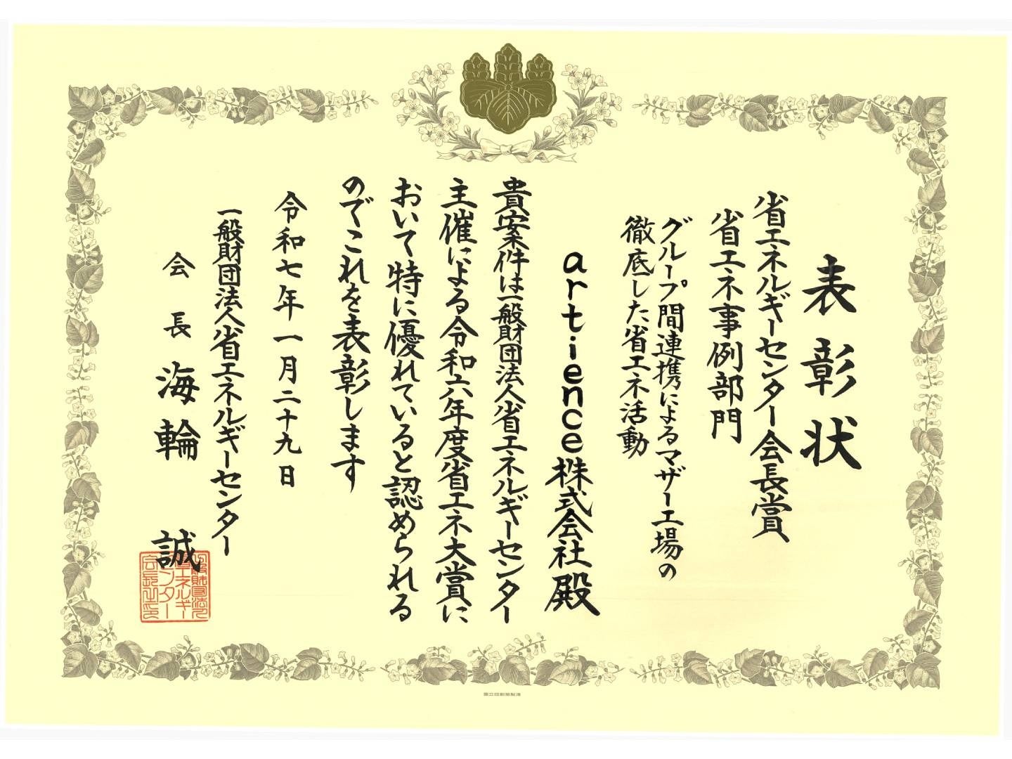artienceグループ、2024年度省エネ大賞で省エネルギーセンター会長賞を受賞
