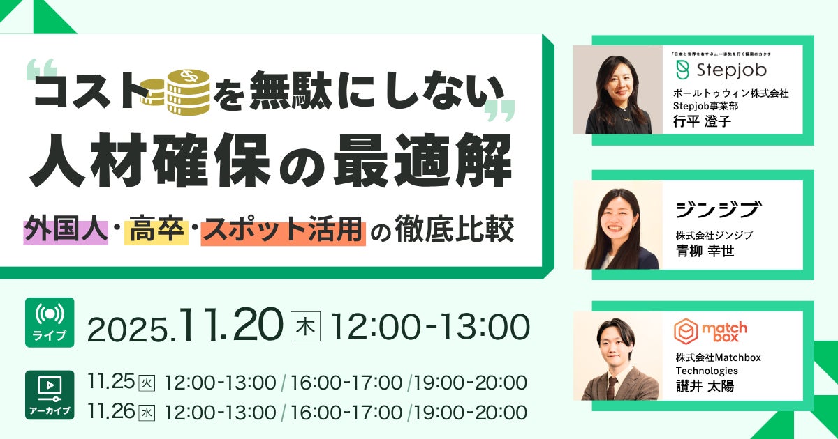 当社は11月20日(木)12:00〜13:00に、ポールトゥウィン株式会社、株式会社ジンジブと共同で、外国人材、高卒人材、スポットワークといった多様な採用チャネルの活用に特化したオンラインセミナーを開催いたします。