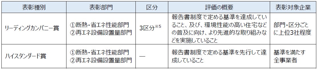 「東京エコビルダーズアワード」では、「リーディングカンパニー賞」「ハイスタンダード賞」の両賞において、「断熱・省エネ性能部門」「再エネ設備設置量部門」を設けており、また、再エネ設備設置量における前年度からの増加率が評価される「ソーラーチャレンジ賞」を加え、計5部門で表彰されます。それぞれの部門に評価方法が定められており、当社が受賞した「リーディングカンパニー賞」「ハイスタンダード賞」の概要は、以下に示す通りです。