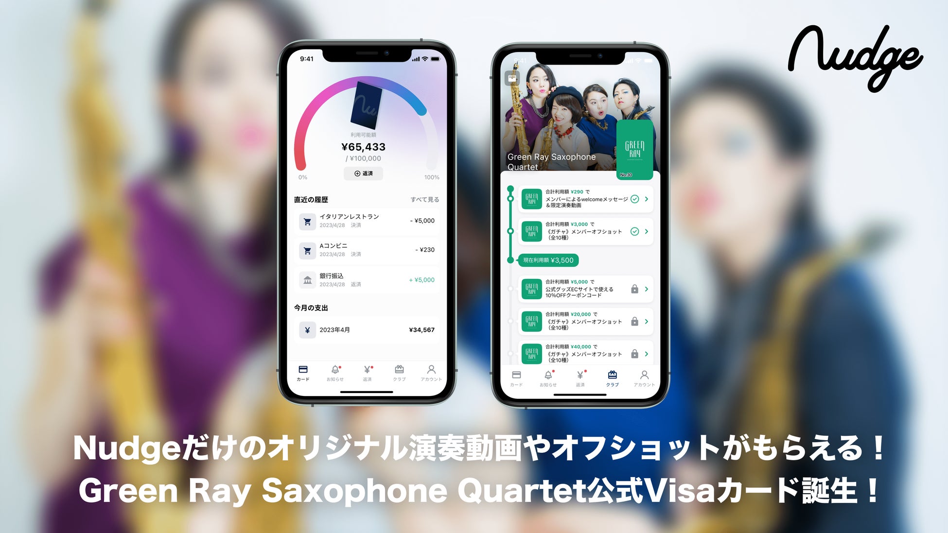 これにより、ナッジカードアプリにて「Green Ray Saxophone Quartet」公式Visaカードのお申込受付を開始します。