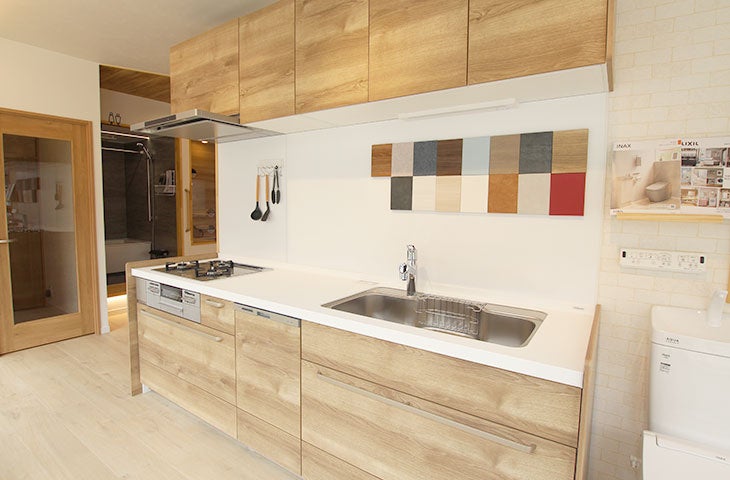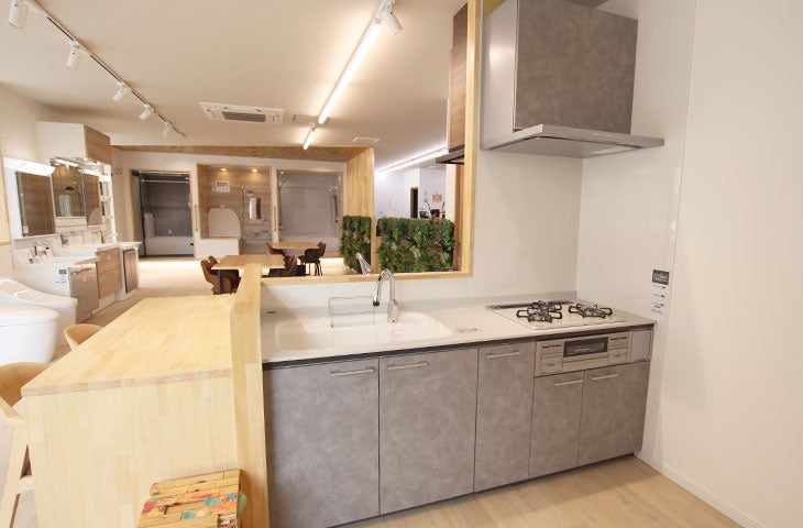 当ショールームには、キッチン3台、ユニットバス3台、洗面台4台、トイレ5台の水まわり商品の展示はもちろん、内装材や窓まわりサッシ商材に至るまで、様々な商品を展示しております。