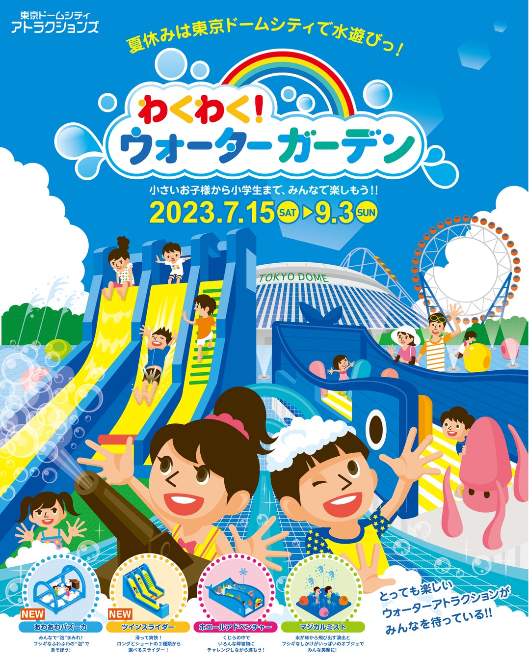 夏休み恒例!東京ドームシティに水遊び広場が登場!『わくわく!ウォーターガーデン』を開催 新たに2機種のアトラクションが初登場!2023年7月15日(土)~ 9月3日(日)