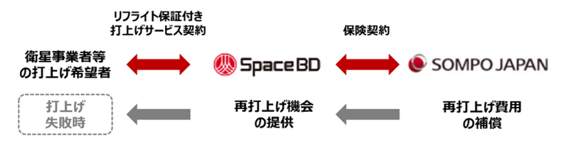 本サービスでは、打上げ希望者が「リフライト保証制度」を利用して、打上げ失敗時に再打上げ機会の提供を受けることができます。打上げ希望者はSpace BDが提供する衛星打上げサービスのオプショナルプランとしてリフライト保証を選択することが可能です。この再打上げに係る費用は損保ジャパンの引受により保険化します。