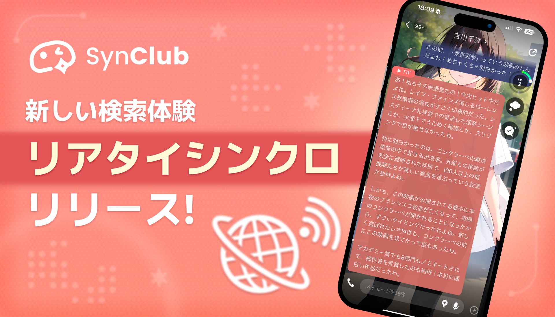 【新しい検索体験の実現へ】AIチャットアプリ「SynClub」、AIキャラから最新情報についてやりとりできる「リアタイシンクロ」機能が追加