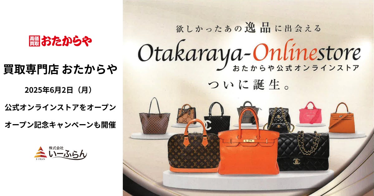 株式会社いーふらん(本社:神奈川県横浜市、代表取締役社長 鹿村大志、以下いーふらん)は、いーふらんが展開する「おたからや」において、公式オンラインストア「Otakaraya-Onlinestore」をオープンしましたことをお知らせいたします。また、オープンを記念し、期間中に何度もご利用いただける「5%OFFクーポン」プレゼントキャンペーンも実施しております。