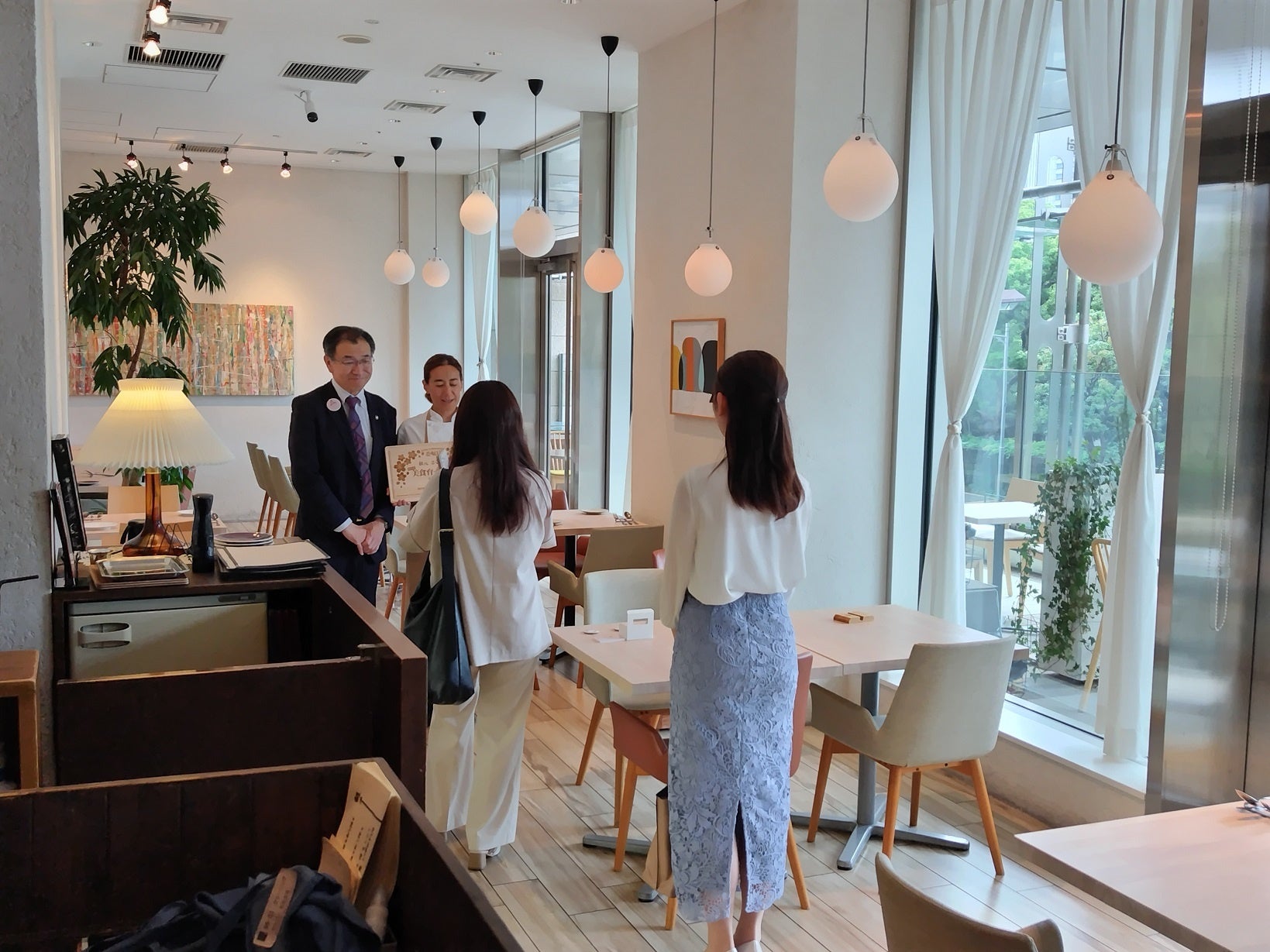 池田市長から手渡された特製委嘱状は、ヒノキ材まな板を応用した木製(40㌢×24㌢、厚み1.5㌢)で、秋元さんの名にちなみ、桜の花をデザインした特注品。レストラン内で、池田市長が「全国でも初めての名称のアンバサダーであり、坂井市の美食、食育がレベルアップすることで、市民にも喜んでもらえる。坂井市の全国アピールに手を貸してほしい」と委嘱状を手渡すと、秋元さんも笑顔で受け取った。