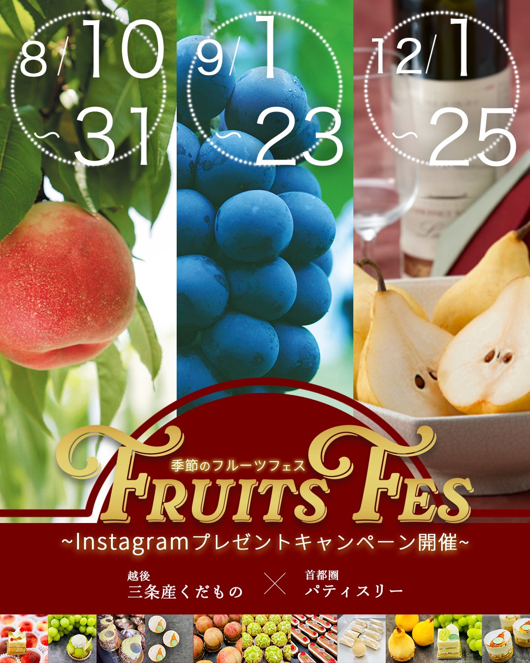 新潟県三条市(市長:滝沢 亮、https://www.city.sanjo.niigata.jp/ 以下、三条市)は、8月10日(土)から3期間にわたり、都内首都圏の人気パティスリーが旬の三条産フルーツを使った限定スイーツを販売します。あわせて、指定のハッシュタグを付けて限定スイーツの写真をInstagramに投稿すると、抽選で三条市の特産品が当たるプレゼントキャンペーンも開催します。