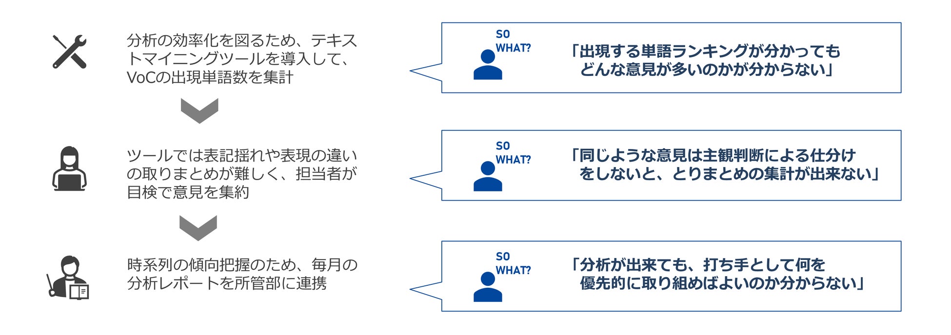 VoCはテキスト形式で表現されているが、その ”扱いにくさ” ゆえにVoC活用の現場では、3つの「SO WHAT?」問題が引き起こされている。