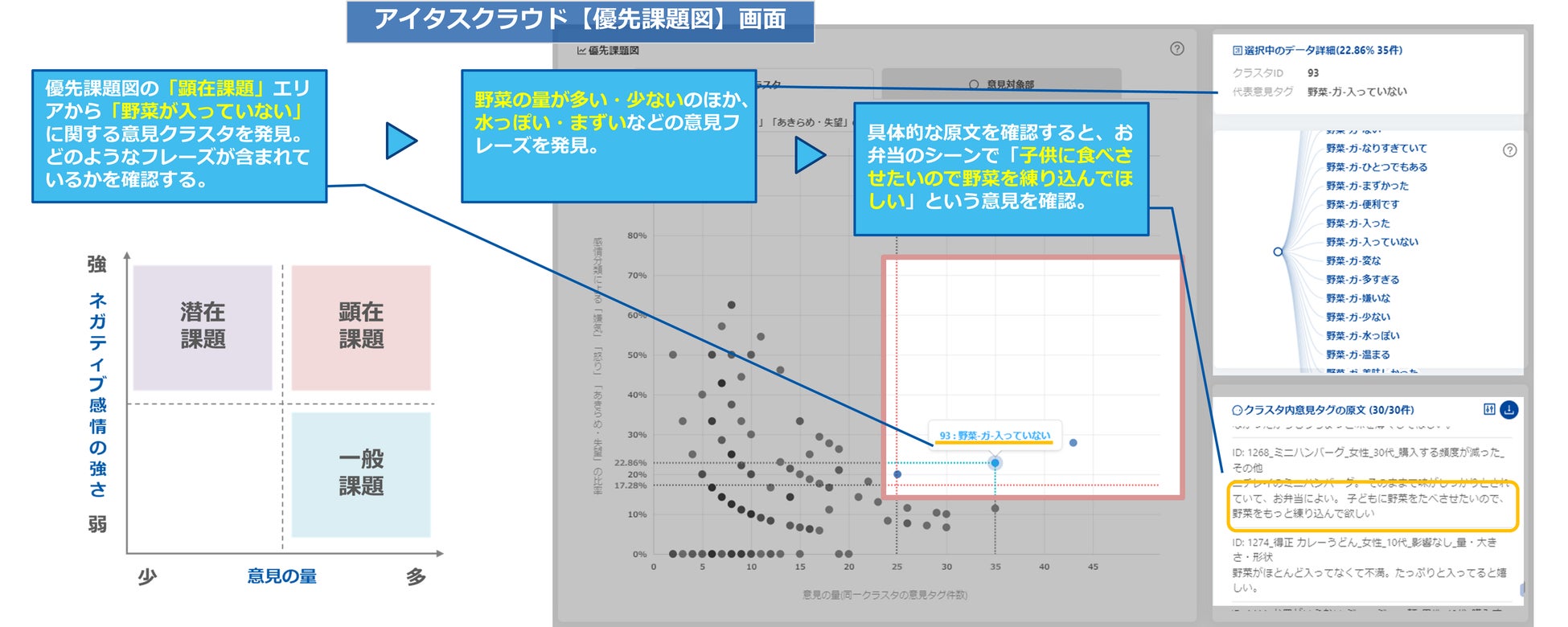 最後に、【感情分類AI】で判定したネガティブ感情の強さを[意見の質」とし、意見の量との2軸でプロットした【優先課題図】をつかい意見を深堀り。