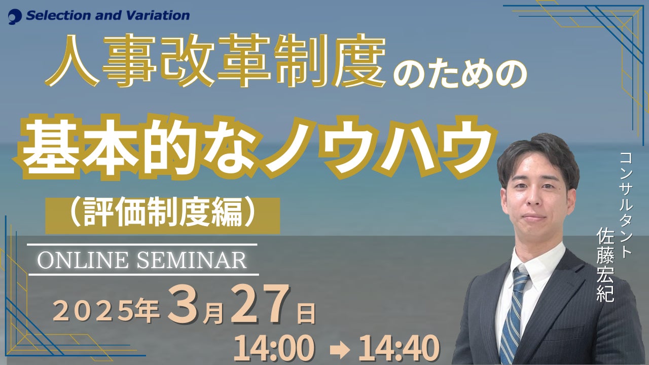 組織・人事コンサルティングファームであるセレクションアンドバリエーション株式会社(以下、当社、東京都千代田区丸の内、大阪市西区、名古屋市西区 / 代表取締役社長:平康慶浩/ URL:https://sele-vari.co.jp/ )は「人事制度改革のための基本的なノウハウ(評価制度編)」セミナーを2025年3月27日(木)14:00〜14:40に開催することをお知らせいたします。