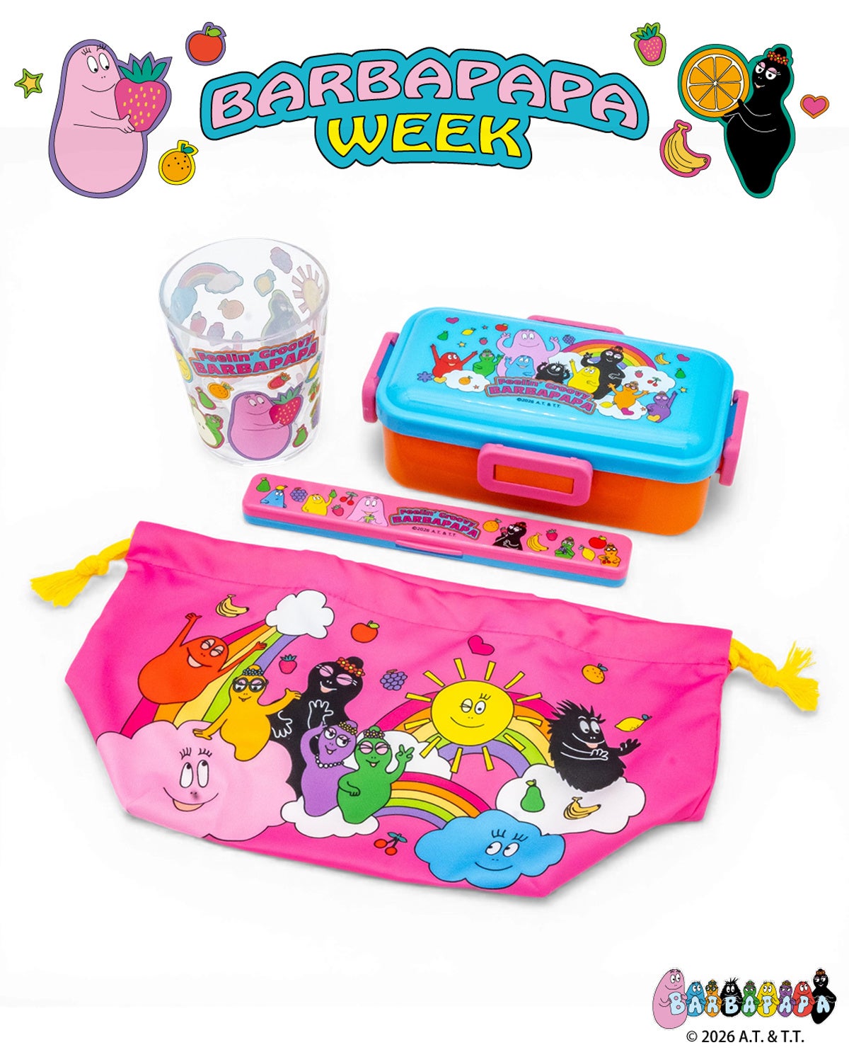 ピンクの生地に「バーバパパ」ファミリーが勢揃いした賑やかなデザインで、ランチタイムの気分を盛り上げます。