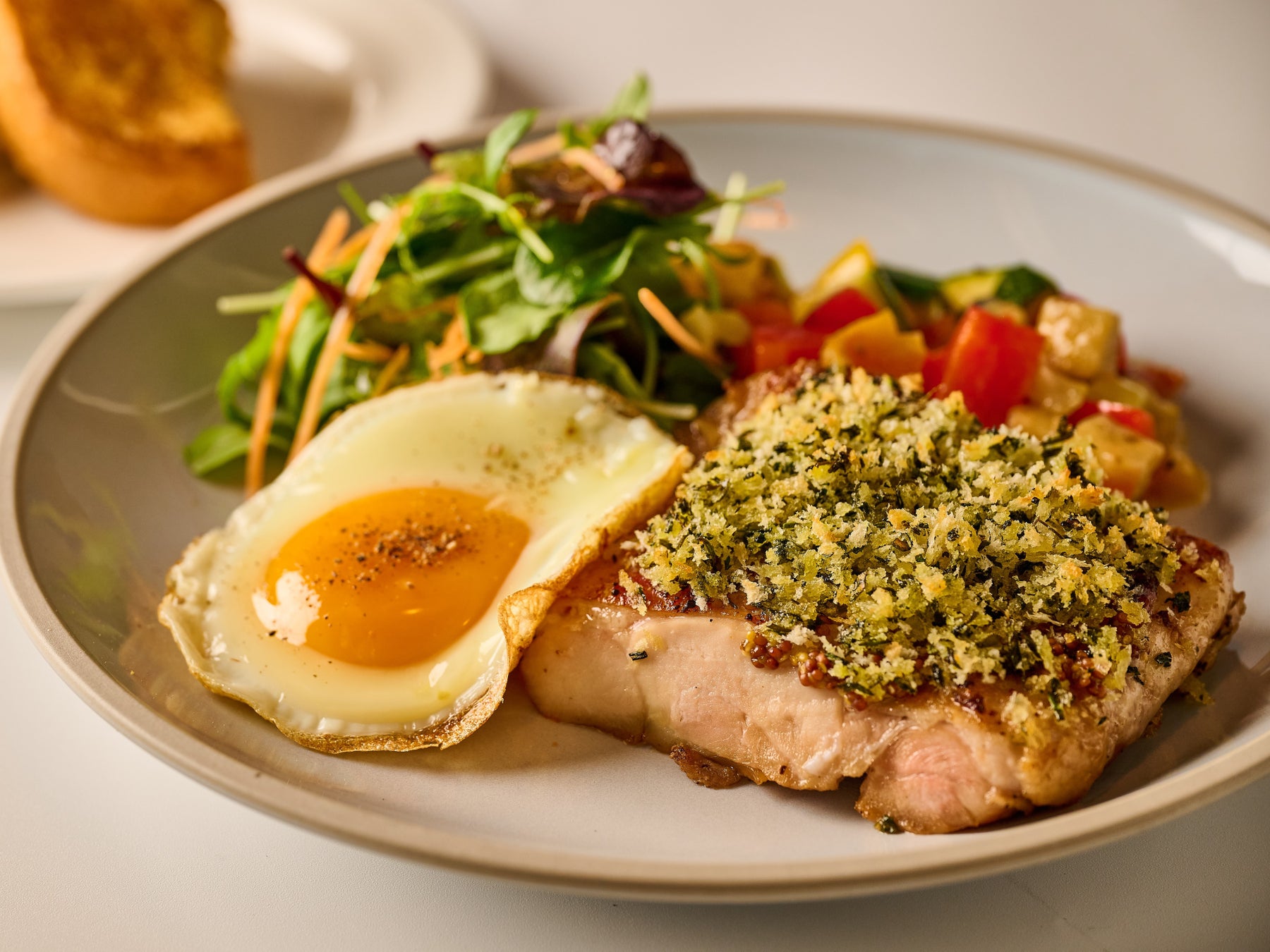 さらに、シーフードサラダ以外のメインには、彩り豊かな野菜をじっくり煮込んで旨みを引き出したカポナータに加え、サラダと艶やかに焼き上げた目玉焼きがつきます。ヘルシーでありながら、しっかり満足できる内容となっております。