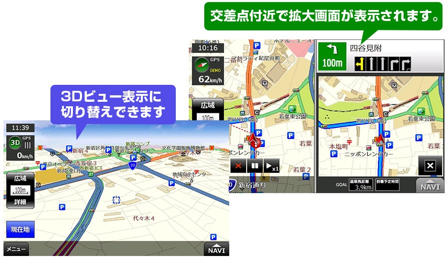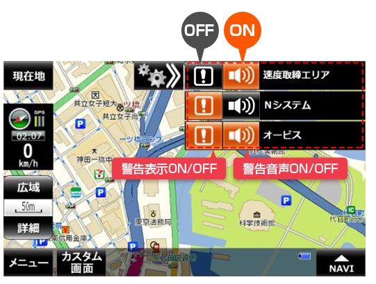 ナビ案内中に、GPS位置データからオービス(速度取締機)設置場所やネズミ捕りエリアを案内。