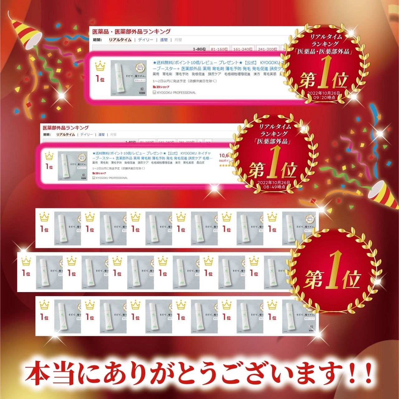 この度、株式会社kyogokuが展開する美容ブランド「KYOGOKU PROFESSIONAL」でも人気の育毛剤「KYOGOKU ネイチャーブースター」が楽天の人気ランキングで20冠を達成いたしました。