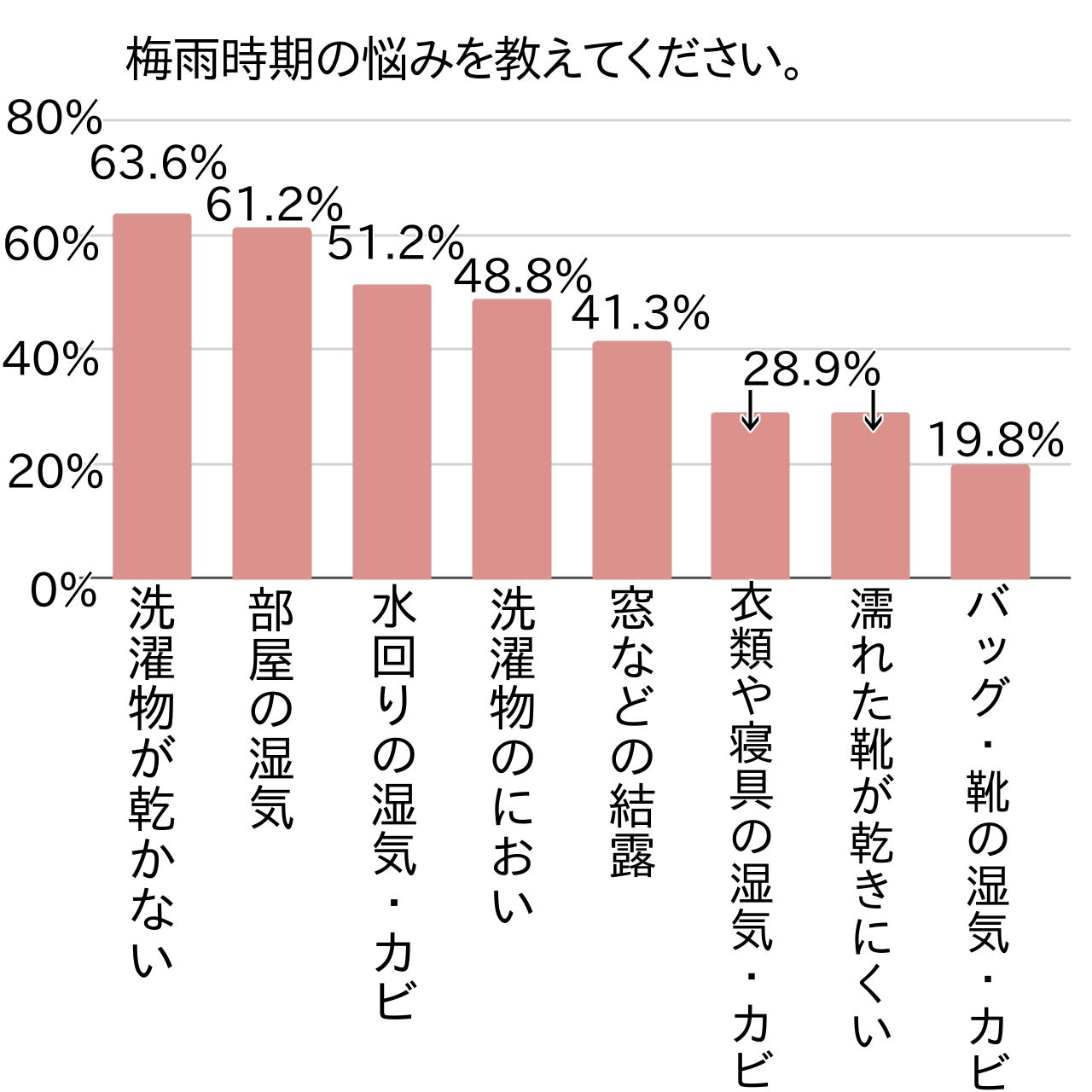 となっていました。ほとんどの方が、梅雨時期の湿気やカビに何らかの悩みを抱えているようです。