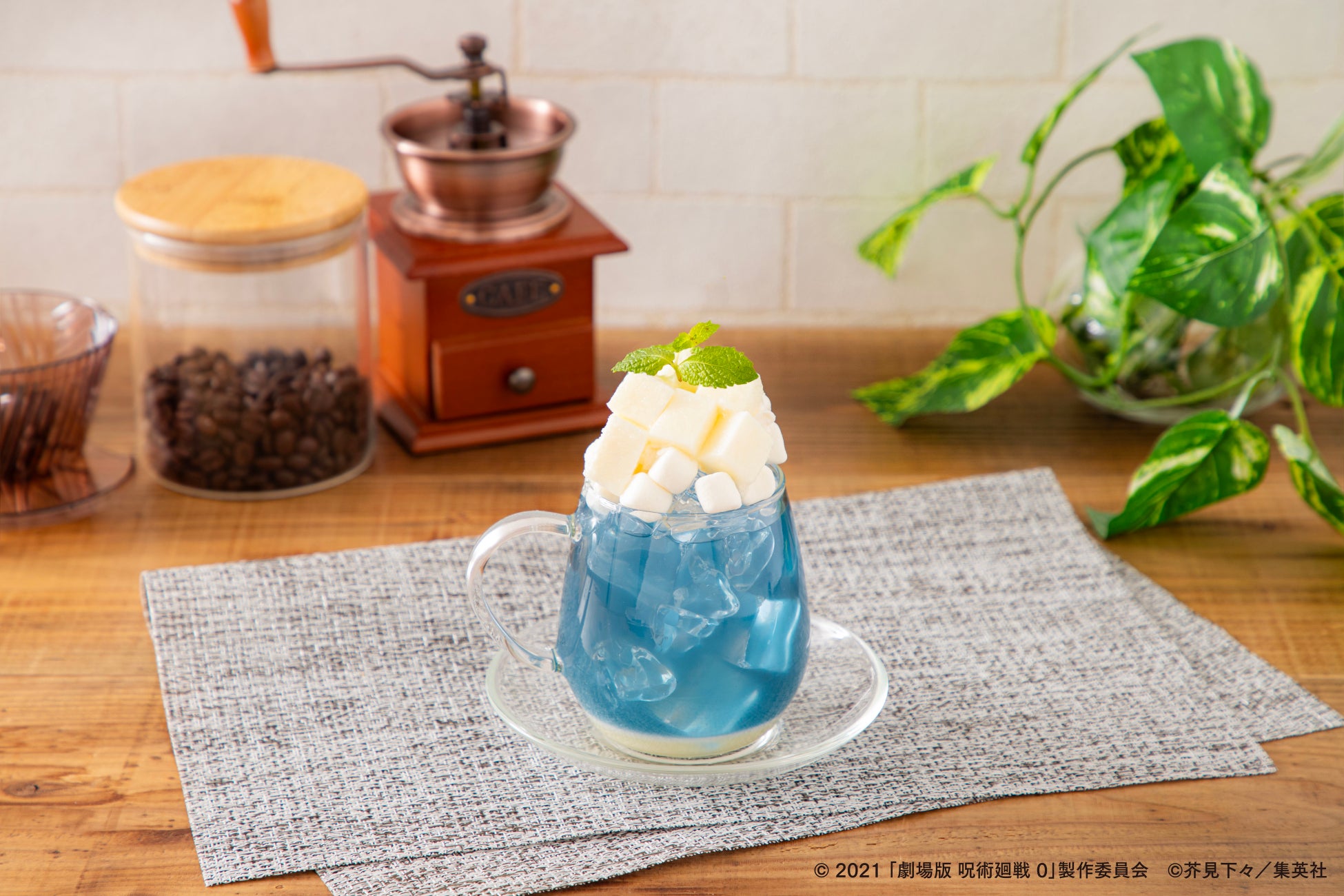 甘党である五条をイメージし、ミルクゼリーにグラニュー糖をまぶして角砂糖に見立てたトッピングのバタフライピーティーラテ。