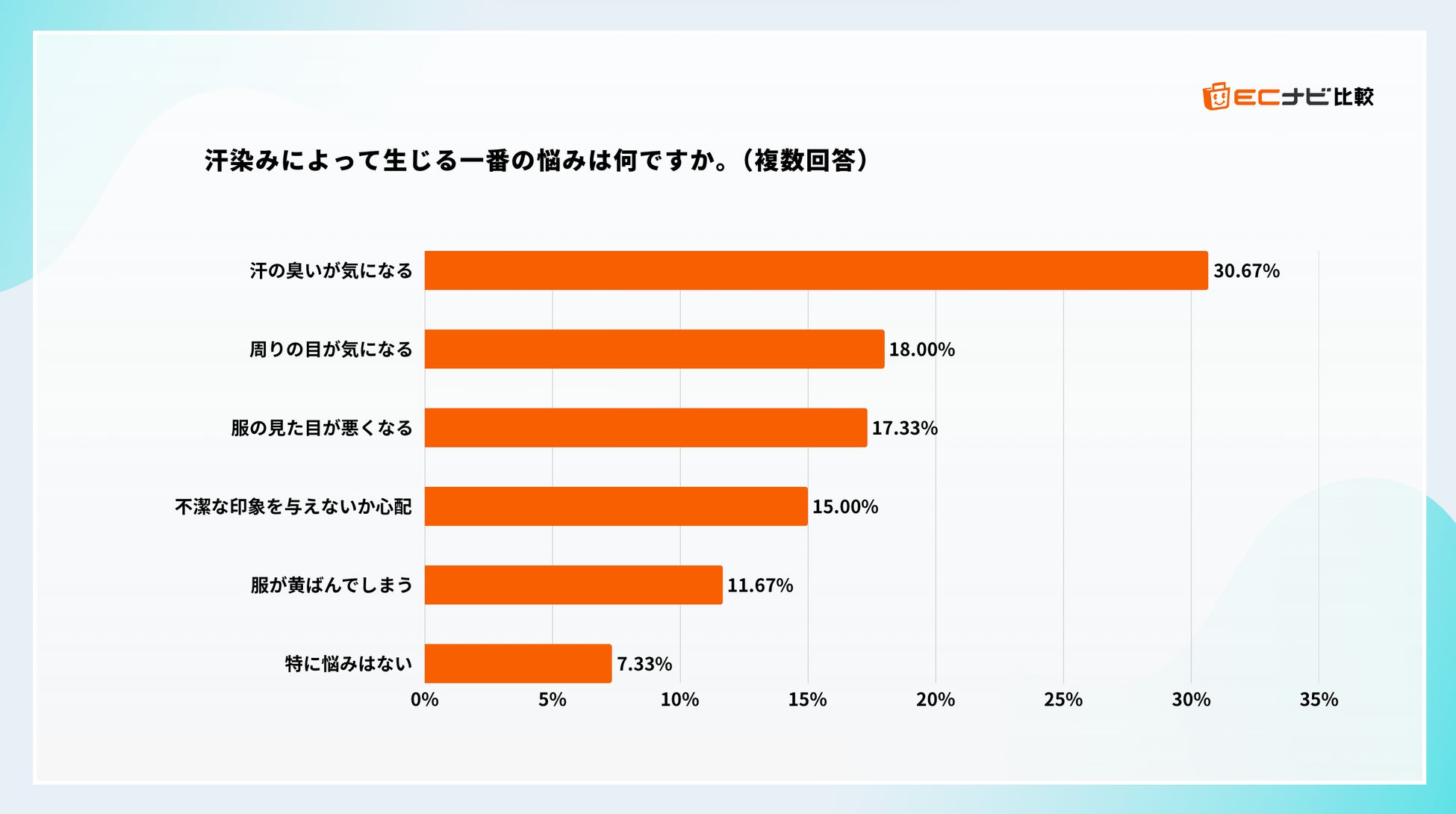 ・汗染みによる一番の悩みは、見た目よりも「汗の臭いが気になる」(30.7%)