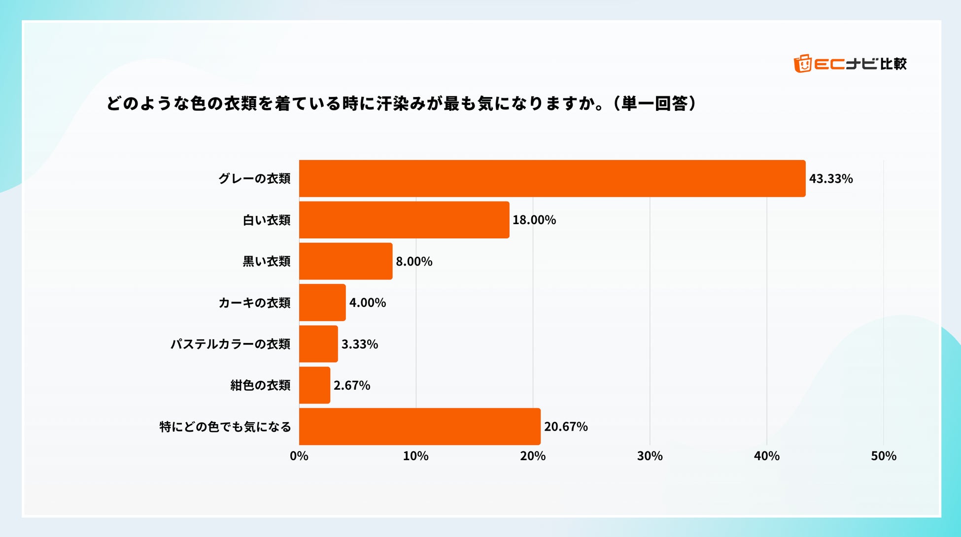 ・汗染みが最も気になる服の色は「グレーの衣類」(43.3%)が圧倒的