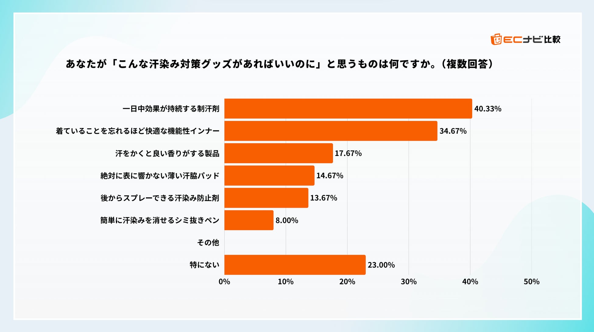 「こんな汗染み対策グッズがあればいいのに」と思うものについて聞いたところ、「一日中効果が持続する制汗剤」(40.3%)と「着ていることを忘れるほど快適な機能性インナー」(34.7%)に多くの回答が集まりました。既存製品の「効果の持続性」と「快適性」を劇的に向上させた製品への強いニーズがうかがえます。