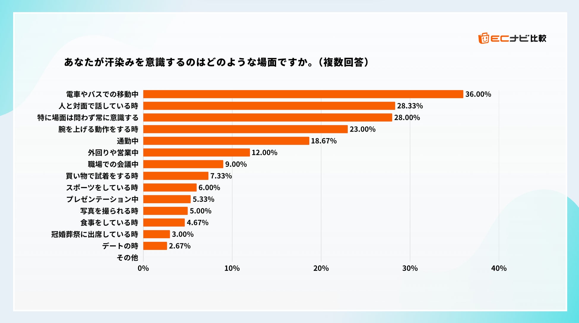 汗染みを意識する場面について聞いたところ、「電車やバスでの移動中」(36.0%)が最も多く、公共の場での他人の視線が気になる状況が挙げられました。次いで「人と対面で話している時」(28.3%)と「特に場面は問わず常に意識する」(28.0%)がほぼ同率で続き、日常的なコミュニケーションや特定のシチュエーションに限らず、常に悩んでいる人も多いことがうかがえます。