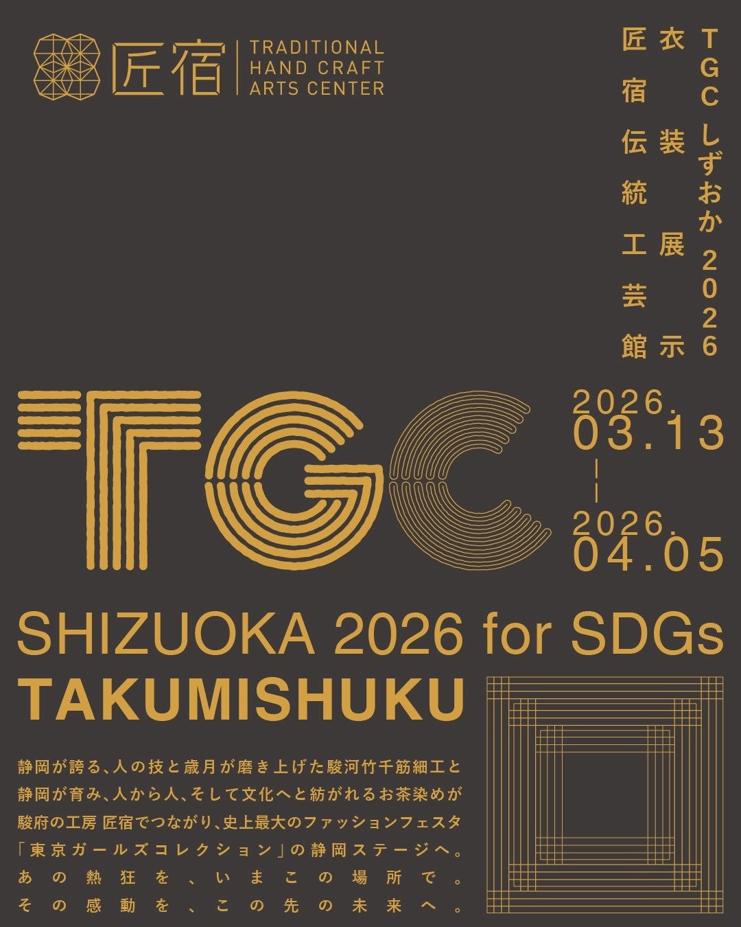 『駿府の工房 匠宿』(株式会社創造舎 代表取締役:山梨洋靖)にて、2026年3月13日(金)から4月5日(日)まで「TGC SHIZUOKA 2026 for SDGs TAKUMISHUKU」開催。