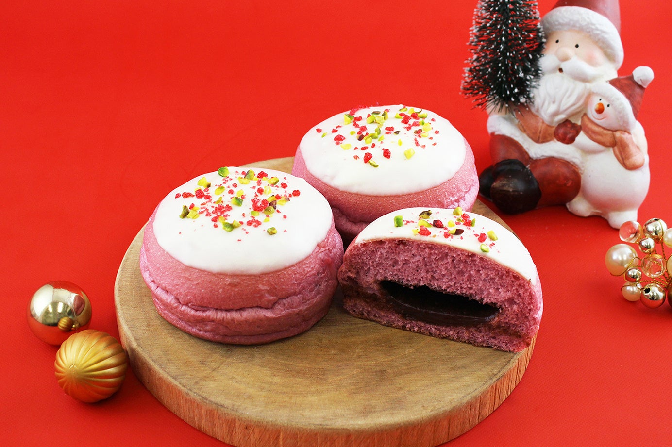 ラズベリーのピューレを練り込んだ湯種入りのもちもちした生地に口どけのよいチョコクリームを包み、焼き上げました。キュートなピンク色の生地を一口かじれば、ラズベリーの甘酸っぱい風味が漂い、なめらかなチョコクリームが溢れ出ます。