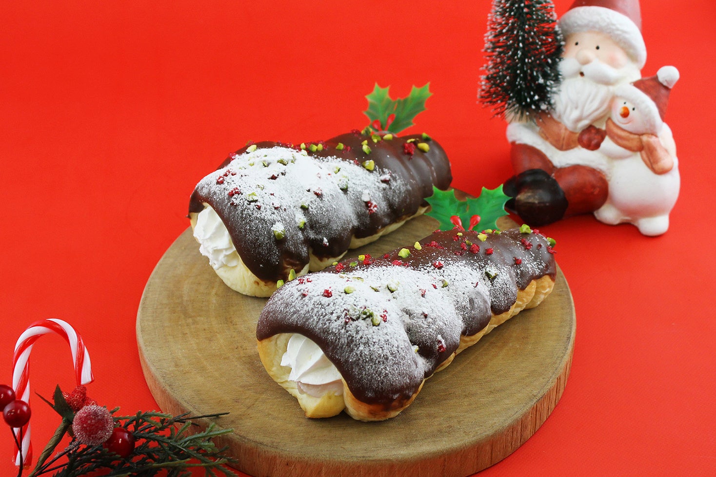 菓子パン生地にホイップクリームを詰めこみ、チョコレートをトッピングしてクリスマスツリーに見立てました。ピスタチオとラズベリー顆粒でおめかししたチョコレートに、たっぷり詰まったホイップは、いつもと違う特別感のある味わい。見た目も可愛らしく、クリスマス気分の上がる一品です。