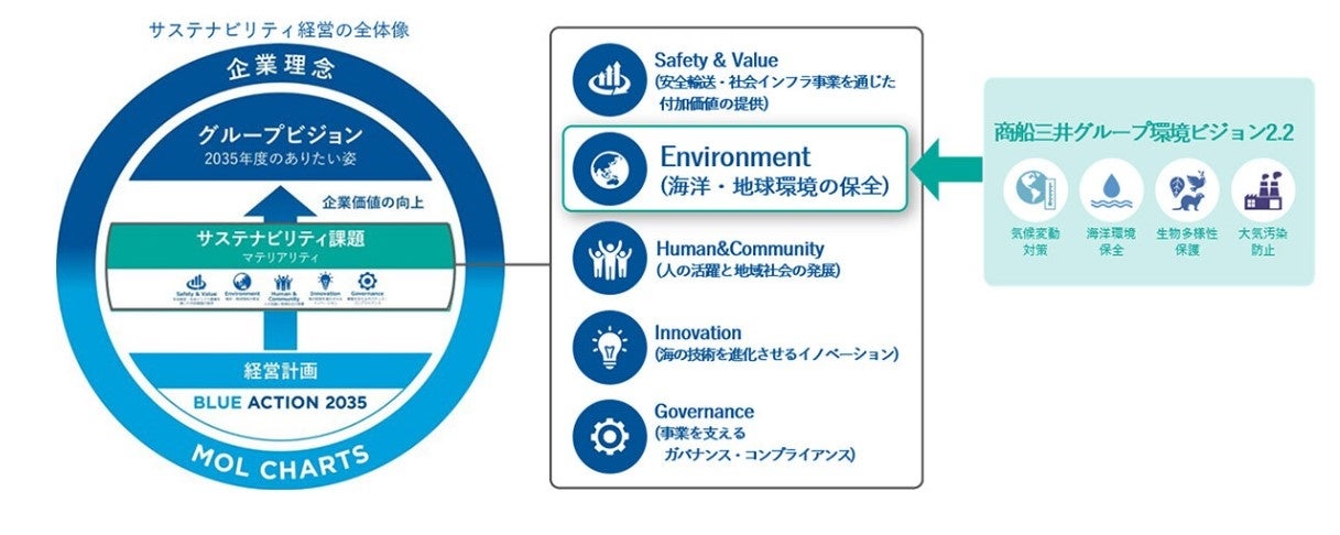 商船三井グループは、海運業を中心に様々な社会インフラ事業を展開し、環境保全を始めとした変化する社会のニーズに技術とサービスの進化で挑むことをグループビジョン https://www.mol.co.jp/corporate/principle/ としています。
