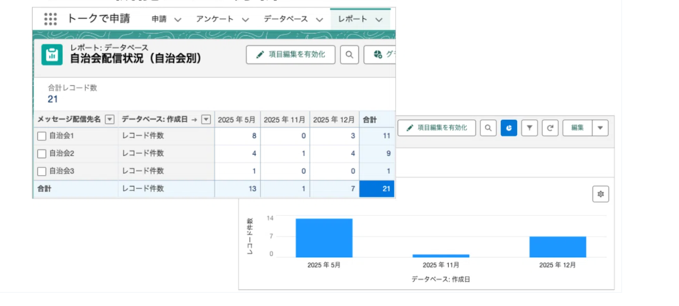 レポート機能による分析も可能なため、例えば、登録者数や自治会ごとの配信数の推移などの把握が容易になります。データはすべてExceやCSVに出力可能です。