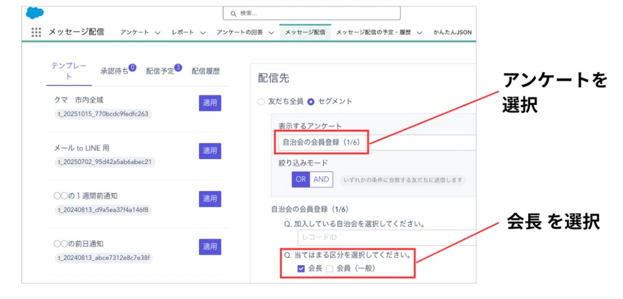 自治会長はLINE公式アカウントから送られてくるアンケートに回答するだけで、その自治会の会員にメッセージを配信できます。一般の会員はこのメニューを使用できないように制限されています。