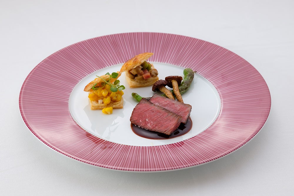 フランス料理の王道スタイルを表現したメインディッシュの一皿。赤ワインをじっくり煮込んで作りあげたソースと、肉汁溢れる黒毛和牛の旨味とのマリアージュで幸福感に包まれる一皿です。付け合わせには、旬野菜とトウモロコシ、キノコと枝豆の2種タルトレットを添えています。