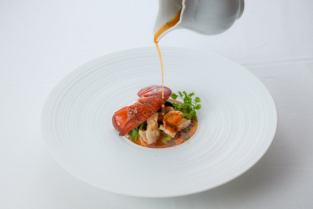 フランスのトリコロール国旗の赤をイメージした一皿です。オマール海老の下には、ニンニクとタイムで香りを付けた今が旬のチンゲン菜を。焼いた五島産パプリカのピューレと、オマール海老の殻から取った出汁にエストラゴンを合わせたソースで爽やかに仕上げました。