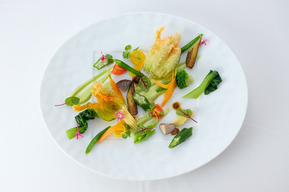 お皿の上で野菜たちが自由にダンスしているような幸福感溢れる一皿。九州各地の旬の野菜を、それぞれの美しさが際立つように盛り付けました。かつて栄華を誇っていた頃のフランスの貴族が、自邸"プチ・トリアノン"の庭園に野菜畑をつくり、自ら野菜づくりを楽しんだという逸話からイメージしたアミューズ・ブーシュの一皿です。