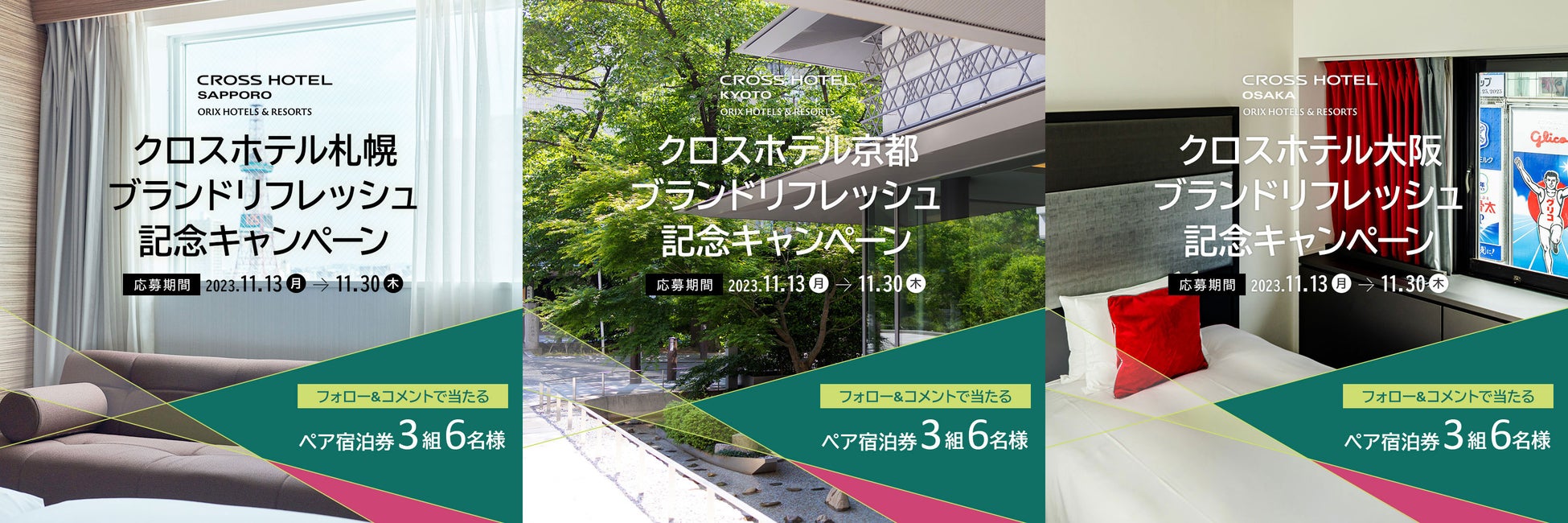 クロスホテル札幌、クロスホテル京都、クロスホテル大阪のInstagram公式アカウントでは、各施設でペア3組6名さまに宿泊招待券をプレゼントするキャンペーンを開催します。ぜひ、対象の施設で誰とどんな体験をしたいかコメントしてください。