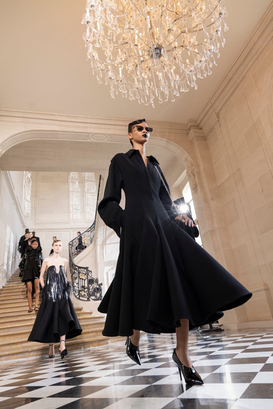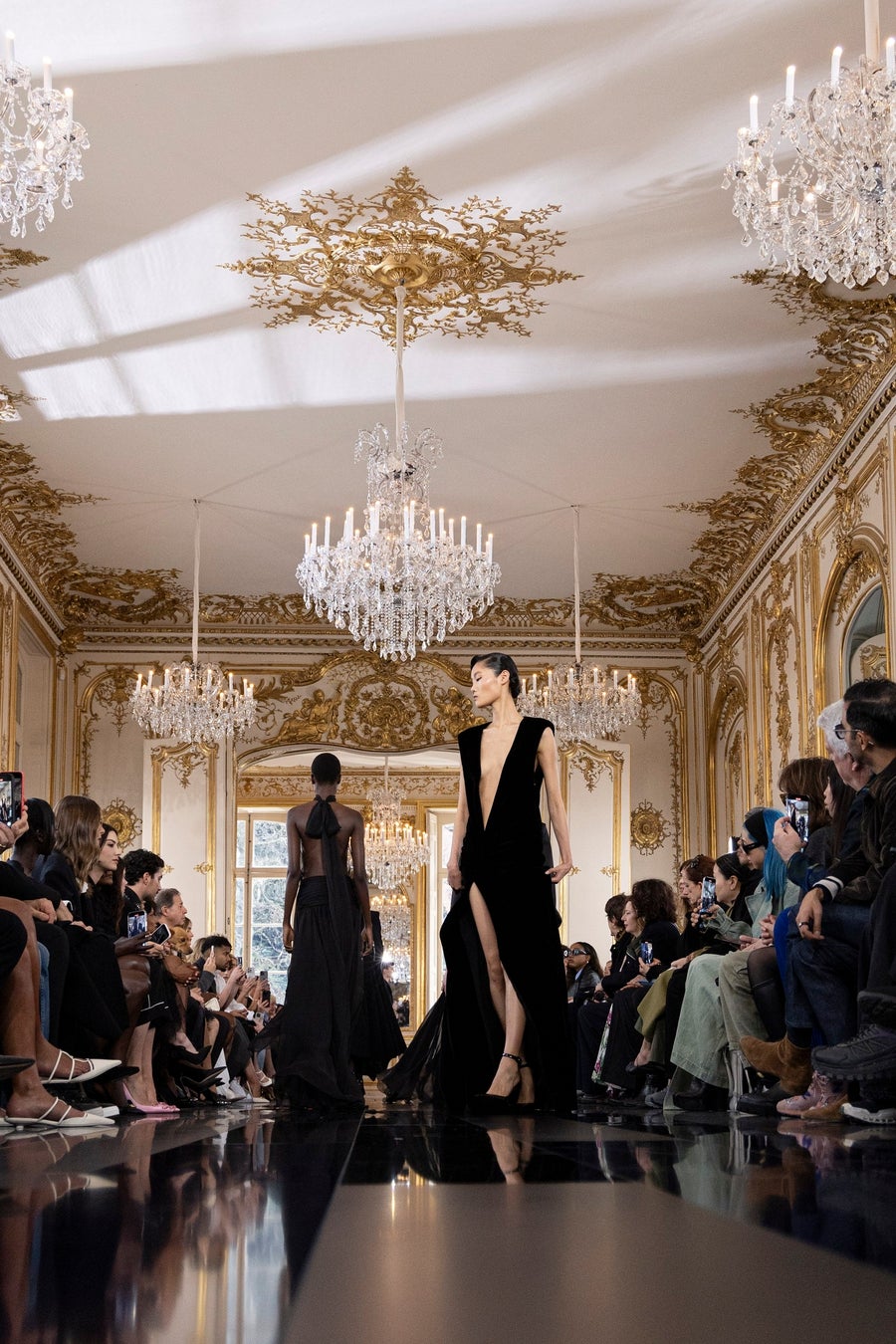 2024-25年秋冬ヴァレンティノ 'ル ノワール' コレクションで、ピエールパオロ・ ピッチョーリは色彩の不在や、モノクロームやモノトーンでの表現ではなく、むしろひとつの中に 無限のニュアンスを持つ色合いのスペクトルを発見し、黒のレンズを通して ヴァレンティノを再考しました。