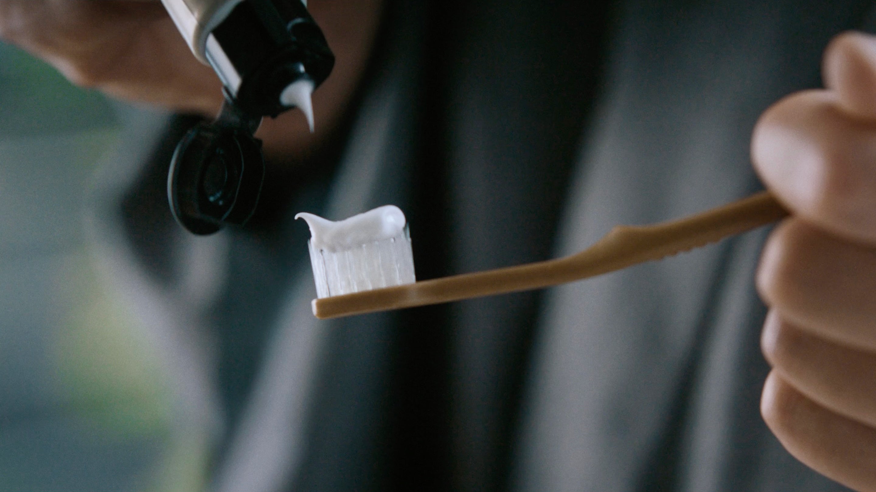 「熟練の職人が作った歯磨き粉」をそっと手にとります。小鳥のさえずりや流れる水の音、高級感のあるピアノ音楽にあわせて、朝の清涼な空気のなかで身支度を整える武藤選手。鏡の前や縁側で微笑む際に白く輝く歯が印象に残ります。