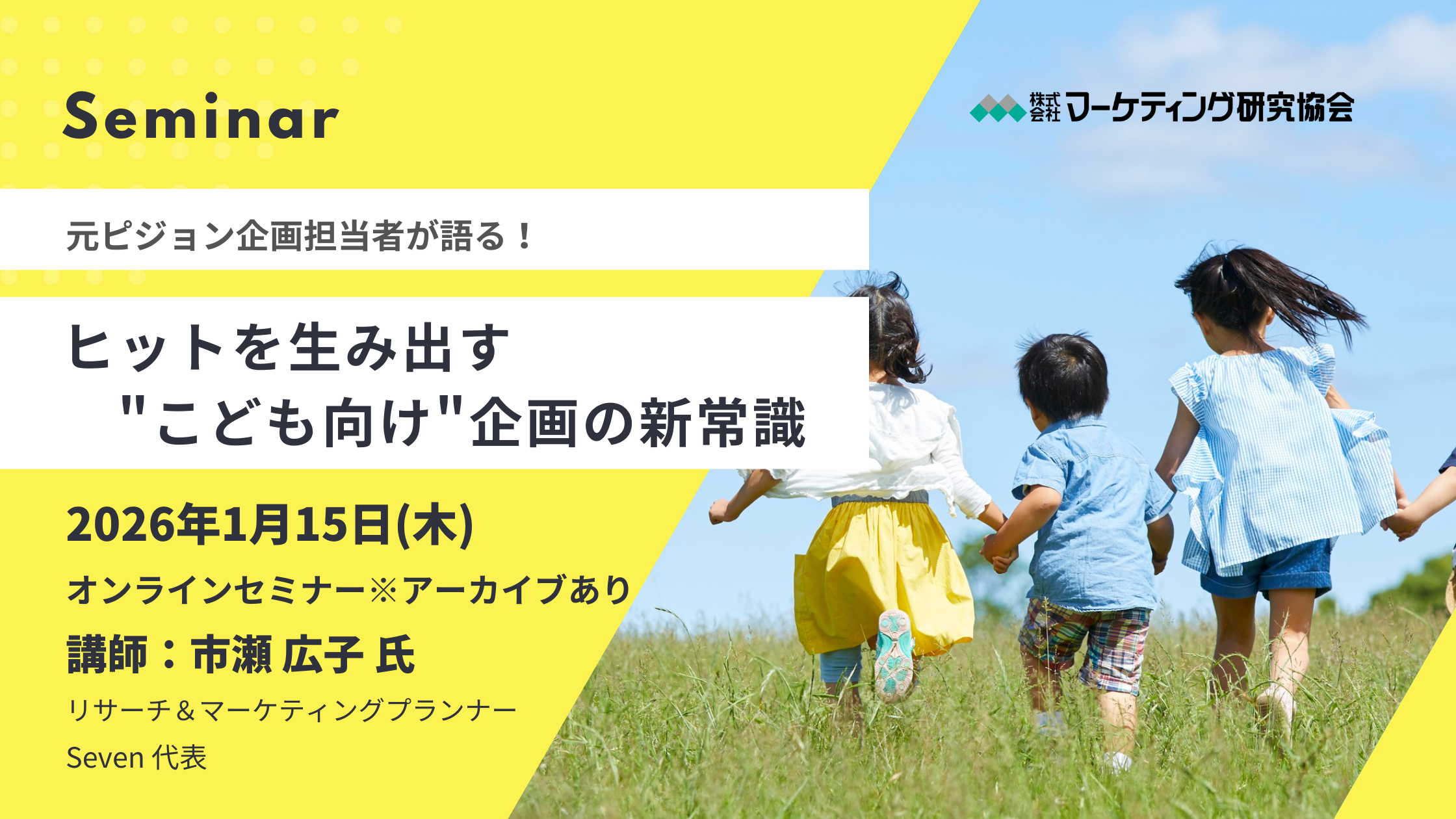 株式会社マーケティング研究協会は2026年1月15日、オンラインセミナー「元・ピジョン企画担当者が語る!ヒットを生み出す"こども向け"企画の新常識」を開催します。期間限定アーカイブ配信あり。