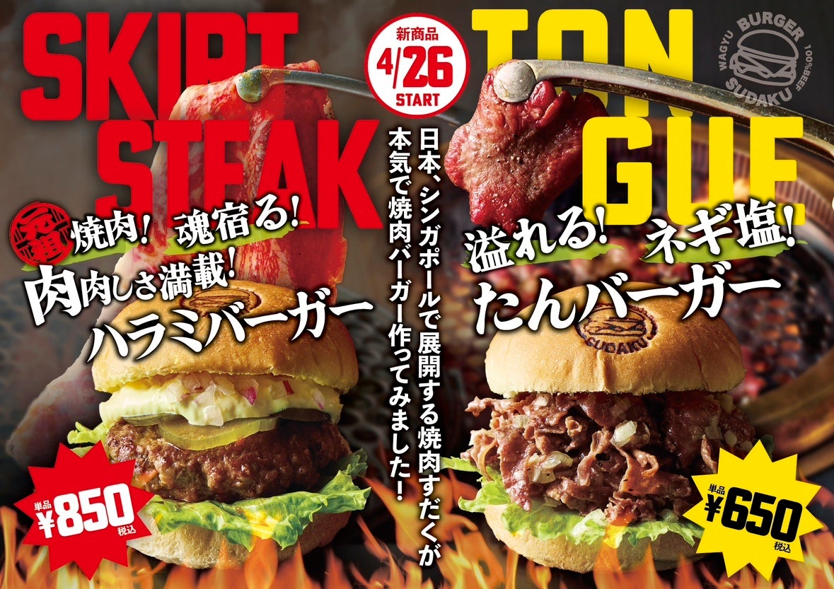 株式会社総合近江牛商社(本社:滋賀県守山市/代表取締役社長:西野 立寛)が運営する『近江牛バーガーSUDAKU』(滋賀県竜王町)に2025年4月26日から「溢れる!ネギ塩!『たんバーガー』」単品価格650円(税込)と「焼肉!魂宿る!肉肉しさ満載!『ハラミバーガー』」単品価格850円(税込)の2種類の新メニューが期間限定で登場いたします。