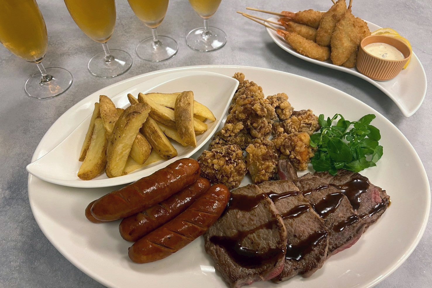お料理は、牛ロースステーキ、フライドチキン、白身魚と海老の串カツ、チョリソー&フライドポテトなど、お酒との相性を考えたこだわりの品々をご用意いたしました。外の暑さを忘れられる心地よい空間で、夏の夕暮れにふさわしい贅沢なひとときをお過ごしください。