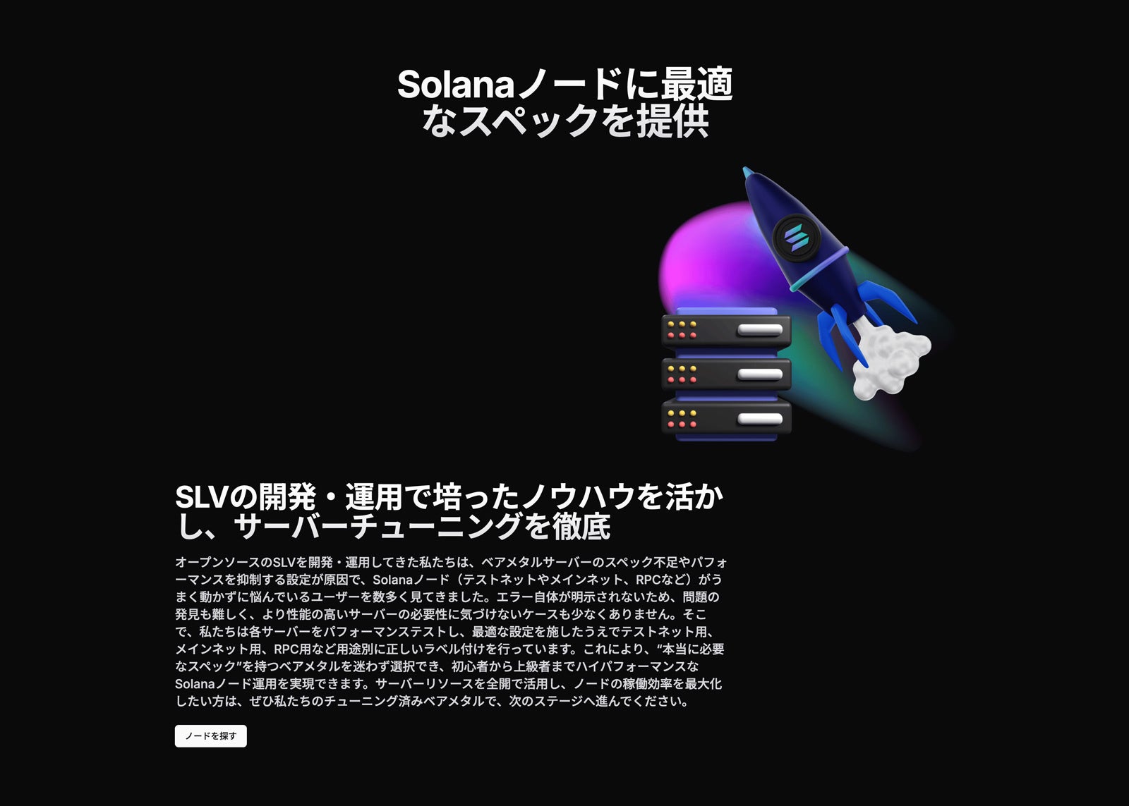 当社が開発・運用を行うオープンソース「SLV」から得た知見をもとに、用途別にサーバーをパフォーマンス検証。テストネット、メインネット、RPC 用など、Solana ノードが必要とするスペックに合ったサーバーを明確化し、ユーザーが迷わず最適な構成を選択できるよう配慮しました。