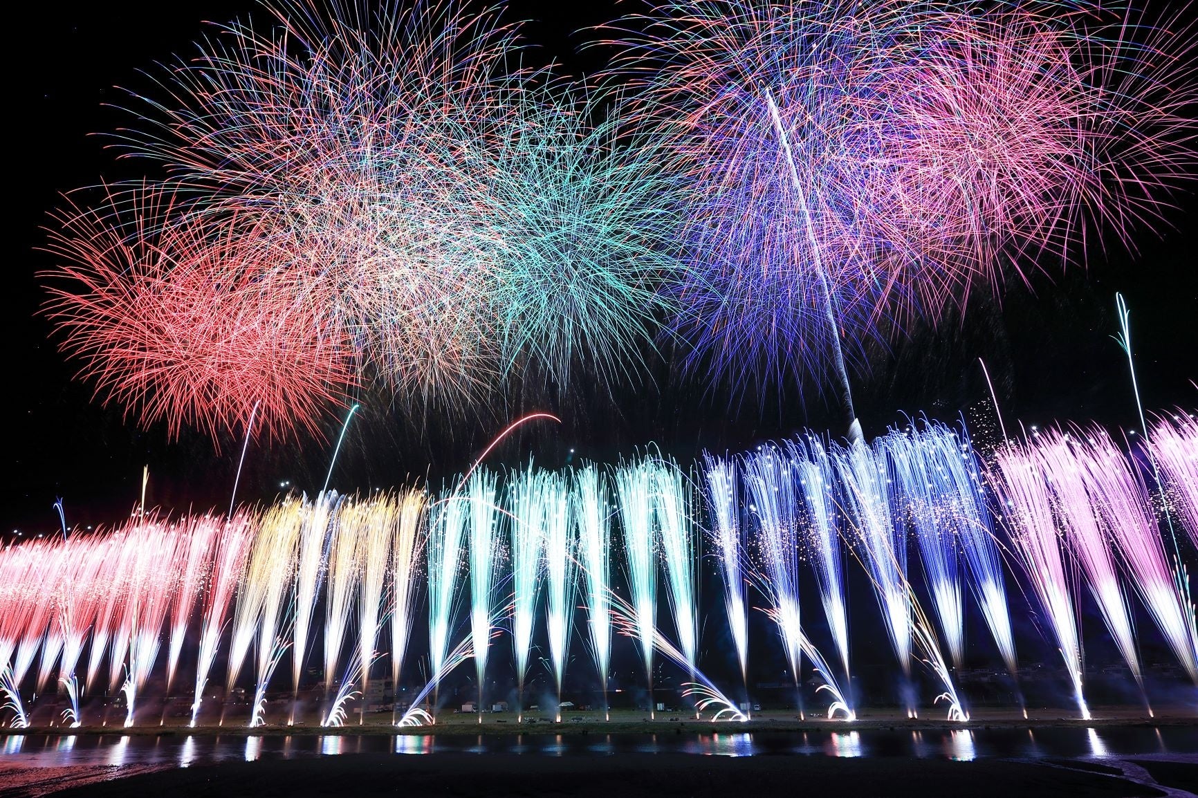 ホテルで鮎塩焼きがついた和食のお弁当を味わった後は、メインの打上場所を一望できる指定席エリアへ移動して花火鑑賞。イスに座ってごゆっくりとお楽しみいただけます。