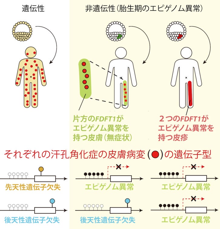 神戸大学大学院医学研究科の久保亮治教授、国立成育医療研究センター周産期病態研究部の中林一彦室長、慶應義塾大学医学部皮膚科学教室の齋藤苑子助教/天谷雅行教授らの研究グループは、汗孔角化症の発症メカニズムの解析を通じて、汗孔角化症の新しい原因遺伝子FDFT1を発見するとともに、エピゲノム異常という、遺伝子のDNA配列の変化ではなく、遺伝子の働きのスイッチがオフになる変化が皮膚病の原因となることを初めて発見しました。この発見は、まだ原因が分かっていないさまざまな疾患の原因究明に役立つことが期待されます。研究グループが発見した新しい原因による汗孔角化症は、他の汗孔角化症とは異なり子どもに遺伝しないため、その診断は多くの患者さんの安心につながると期待されます。さらにこのタイプの汗孔角化症にスタチンの外用が効果的であることが分かり、汗孔角化症の新しい治療法開発への道が拓かれました。